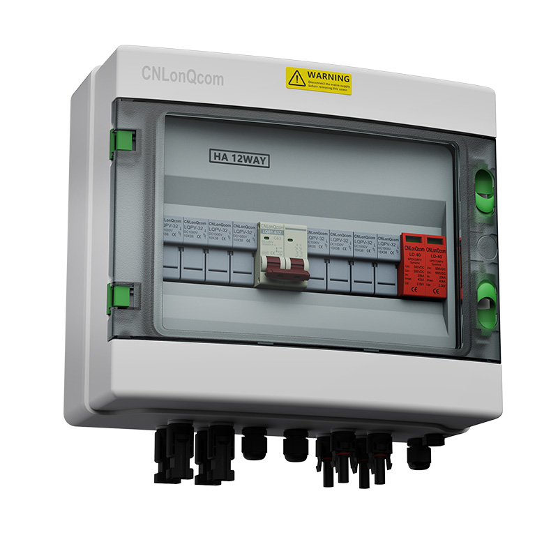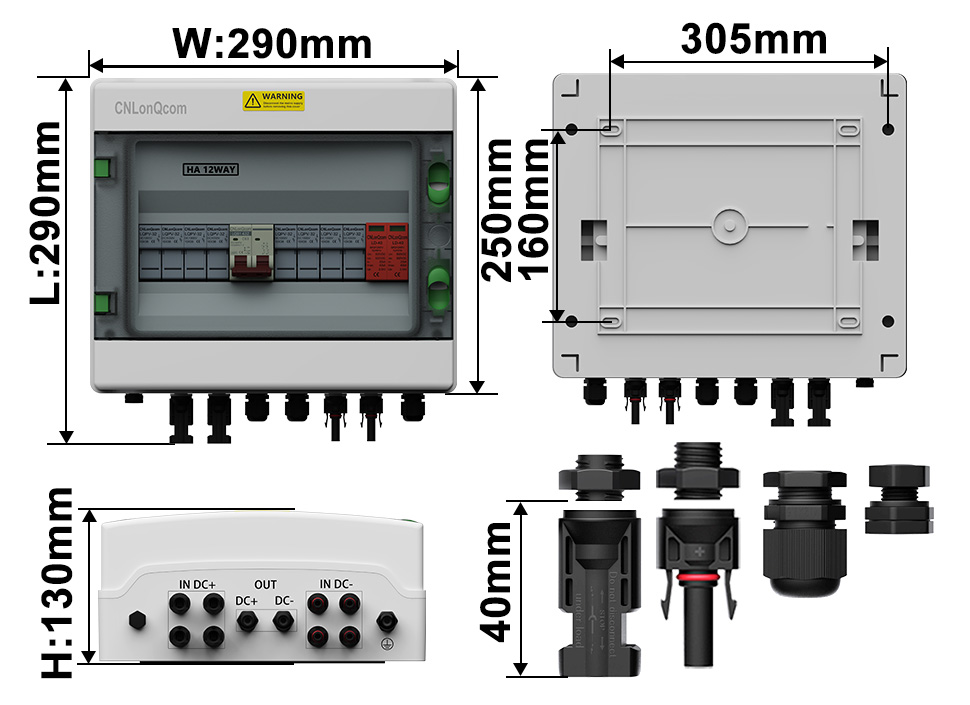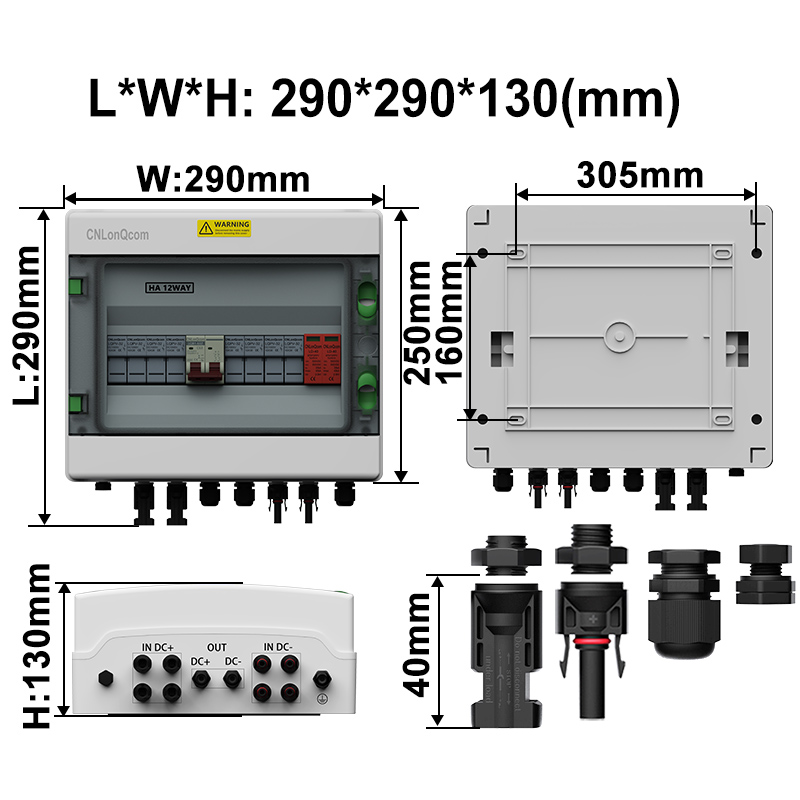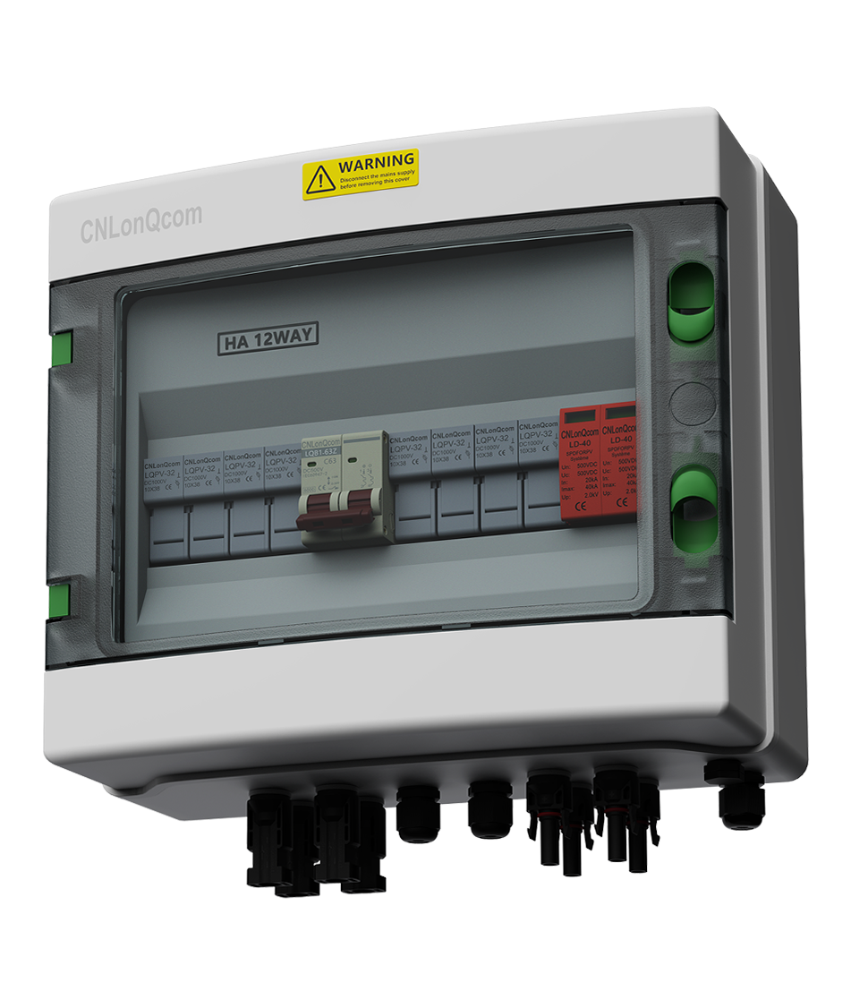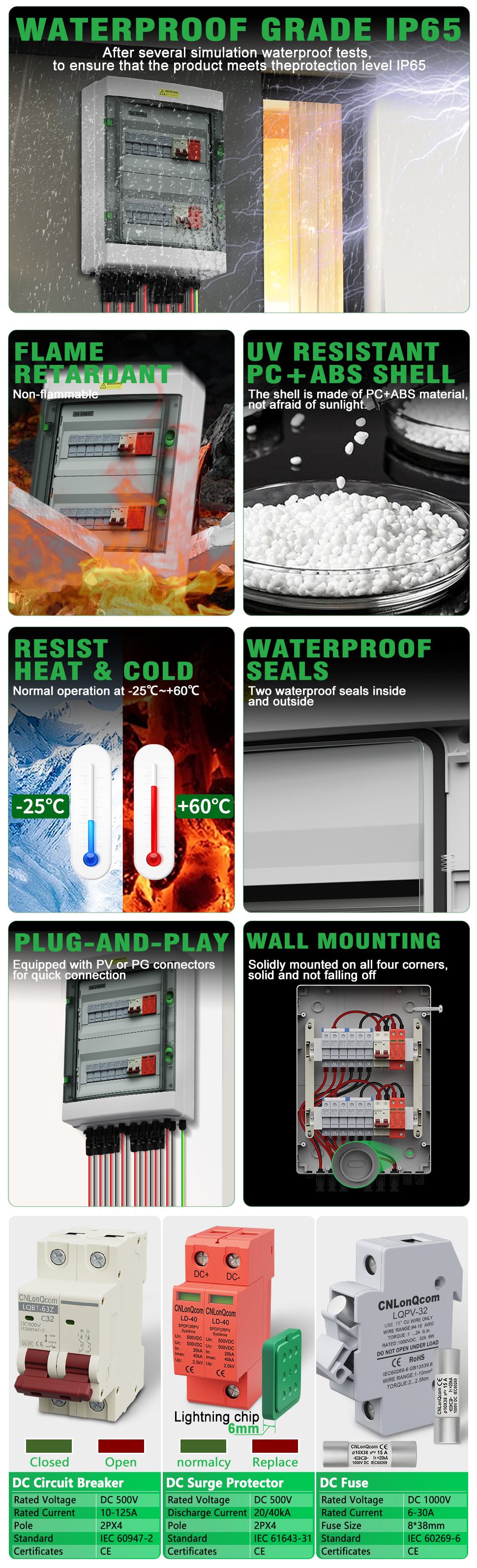 Sraith HA CNLONQCOM Plaisteach PV PV BOSCA 4 IN 1 AMACH DC500V Tá cás uiscedhíonach PC+ABS le tógáil séalaithe, cosaint ró -ualaigh, cosaint chiorcaid ghearr, cosaint ró -voltais, deannach, taise agus cosaint tintrí.
